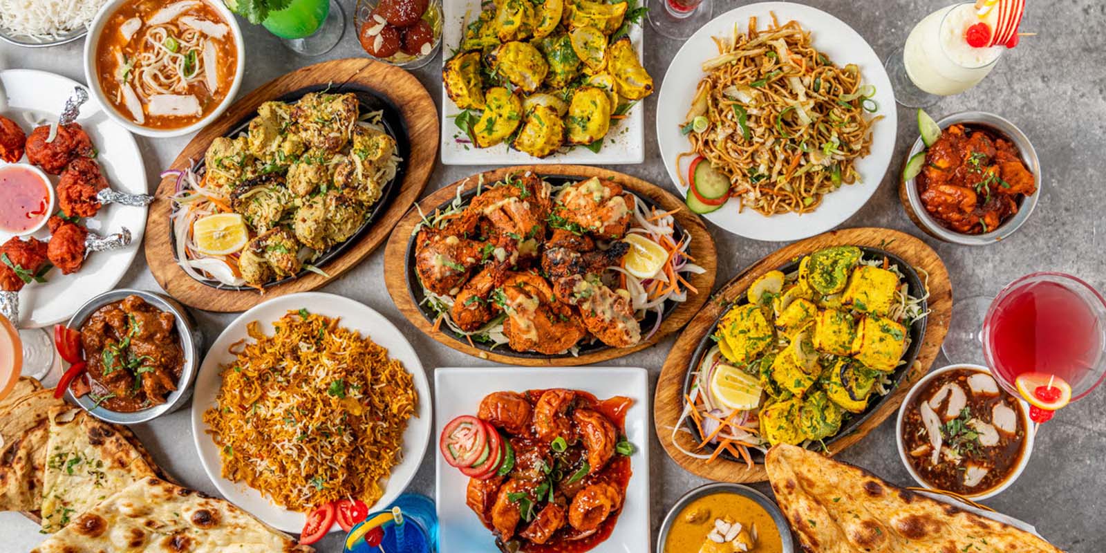 Selection of 4 Entrees Samosa, Onion Bhaji, Chicken tikka and Lamb Seekh kebabs.